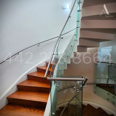 Bóveda catalana, barandales de vidrio templado y escaleras de madera.